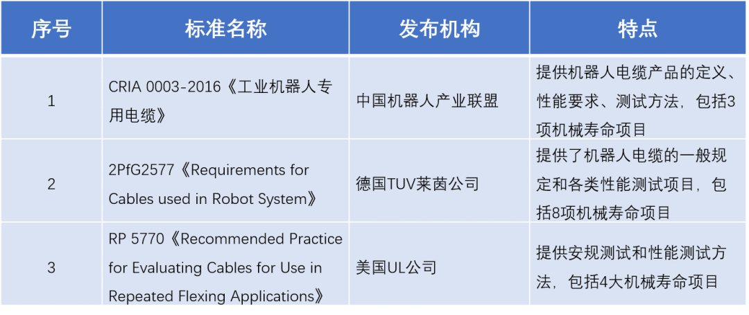 当前的机器人电缆标准及测试规范主要以行业标准和企业标准为主,国外主要是德国TUV莱茵公司发布的2PfG2577,国内主要是中国机器人产业联盟发布的CRIA 0003-2016。