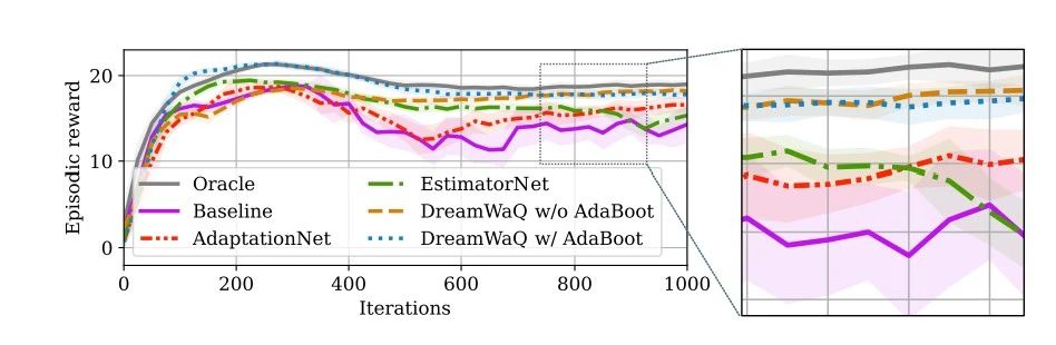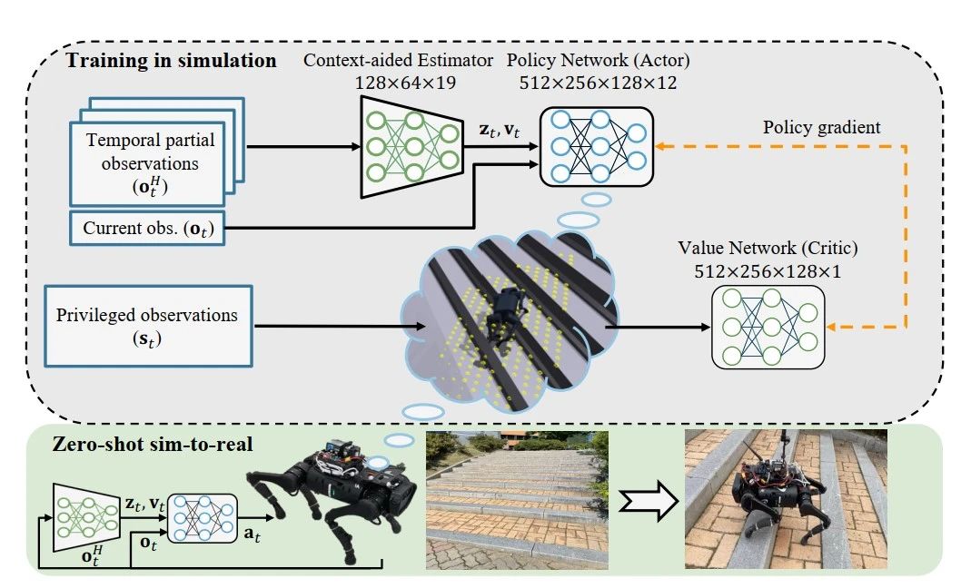 在 DreamWaQer 机械狗的实际测试中,只进行了策略网络的学习,在看不到周围环境的情况下,它仅使用机器人内部的惯性传感器 (IMU) 和关节角度的测量估计机器人当前的状态。