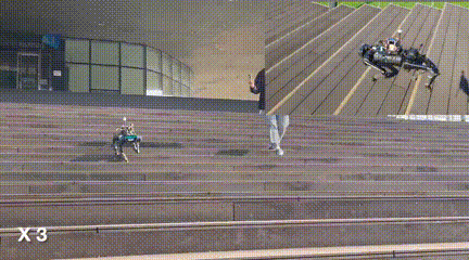 在这些任务中,机械狗是完全看不见的,所以它并不知道下一秒自己会身处什么环境,但当脚触碰到台阶的那一刻,它就能快速地做出调整并适应当下。